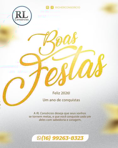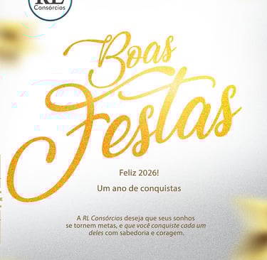 Chegamos ao fim de mais um ciclo, e é tempo de renovar a esperança em um ano cheio de oportunidades. Que 2026 seja um período de crescimento, paz e realizações para você e toda sua família. A RL Consórcios deseja que seus sonhos se tornem metas, e que você conquiste cada um deles com sabedoria e coragem. Estaremos aqui, prontos para te apoiar em mais um ano de grandes decisões e transformações. Feliz Ano Novo! Que não faltem fé, saúde e prosperidade em cada dia de 2026. 🍾